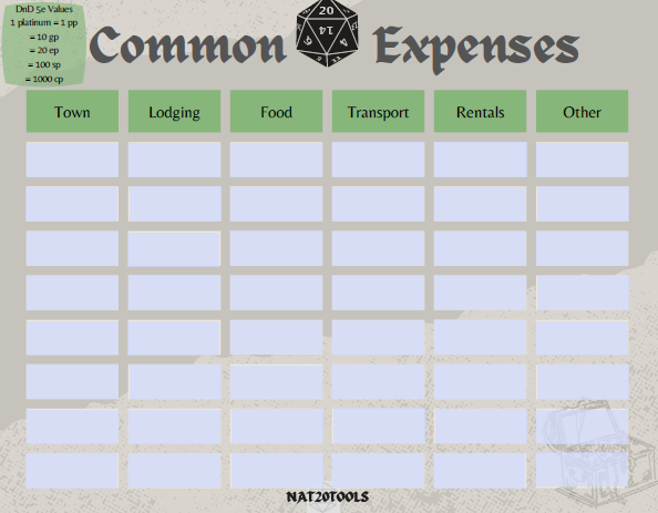 Campaign Outline, Character Info Sheets, Common Expenses