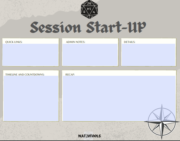 Session Zero, Session Prep, Session Quick-Start, Session Notes